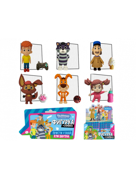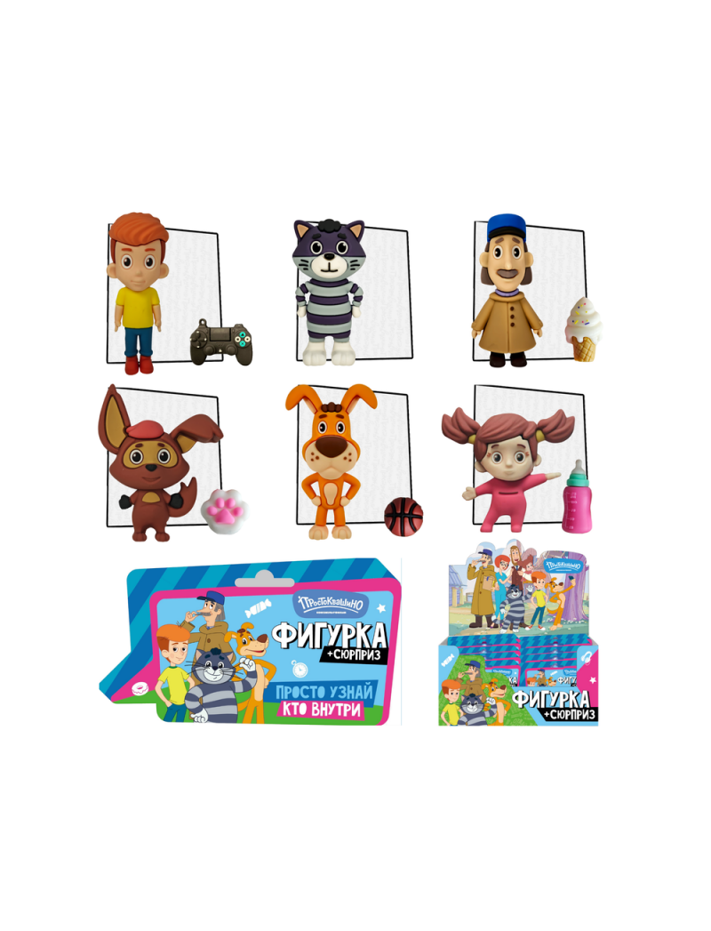 В каждом непрозрачном флоупаке — одна фигурка: Шарик, Матроскин, Дядя Фёдор и другие персонажи. Компактный размер, качественная детализация, приятный на ощупь пластик.