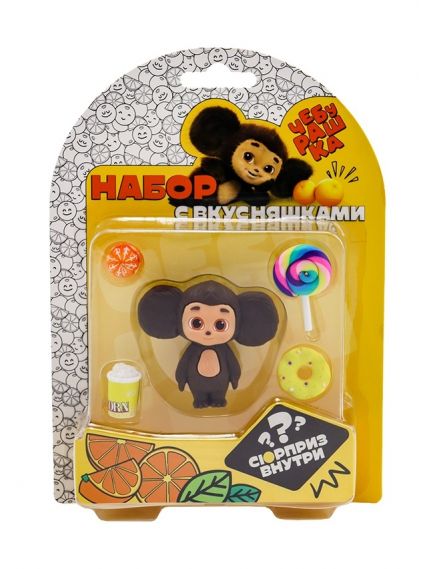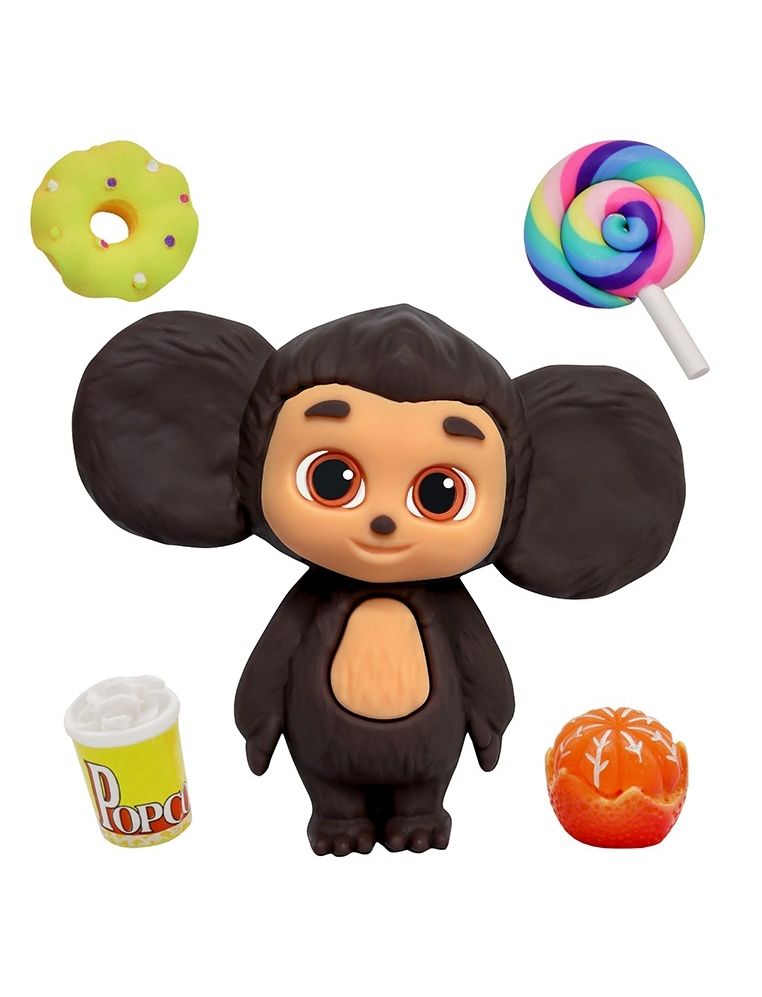 - В наборе: 1 фигурка чебурашки и 5 аксессуаров (попкорн, мандаринка, радужный леденец, зеленый пончик и красная конфета)