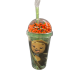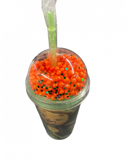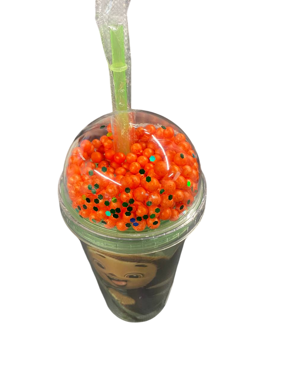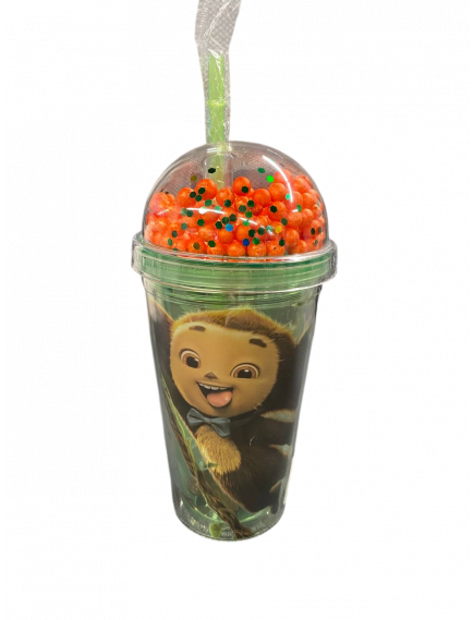 Пластиковая кружка "Чебурашка ", украшенная принтом с изображением Чебурашки и миниатюрной фигуркой персонажа внутри прозрачной крышки
