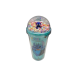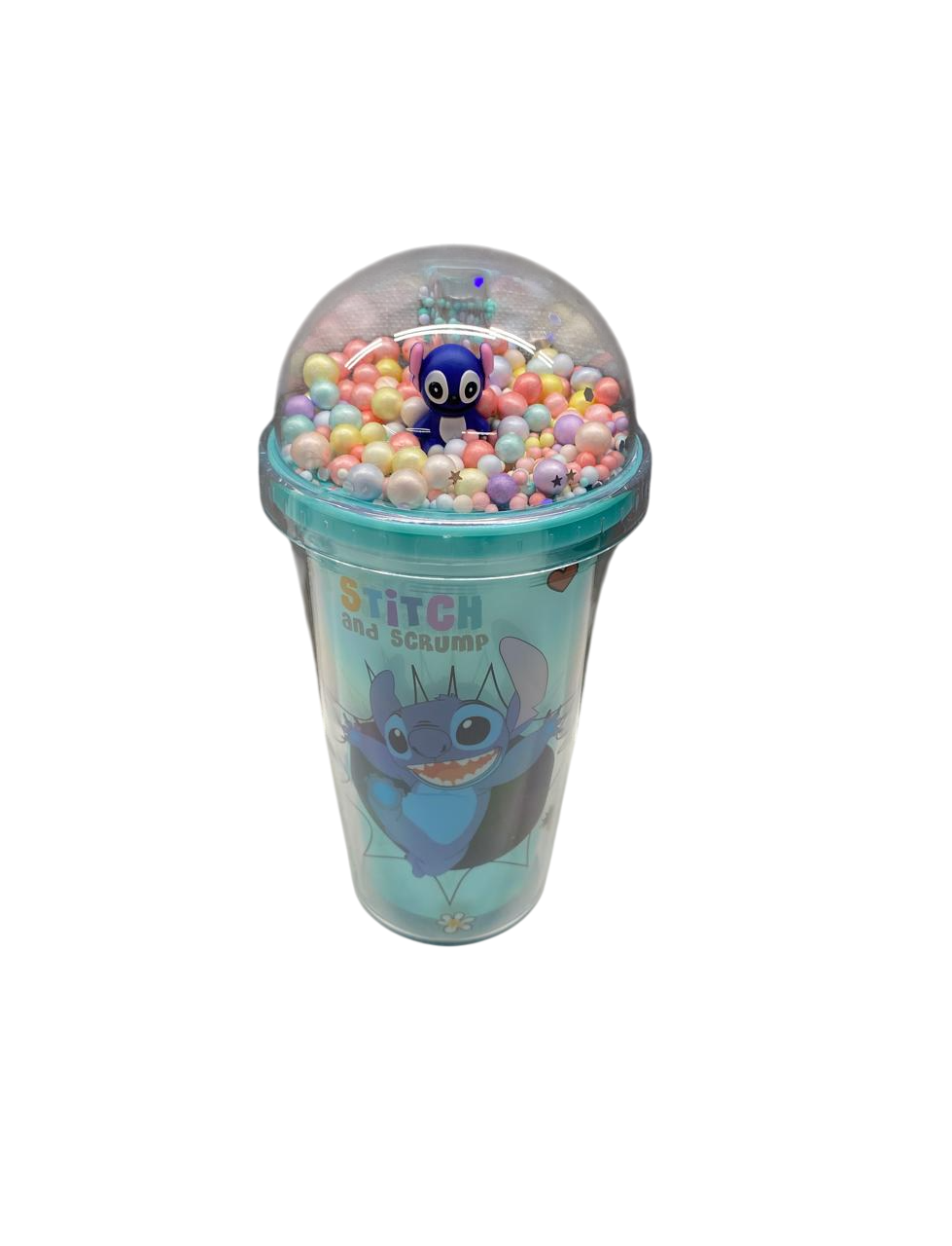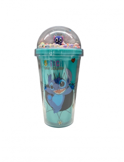 Пластиковая кружка "Стич", украшенная принтом с изображением Стич и миниатюрной фигуркой персонажа внутри прозрачной крышки